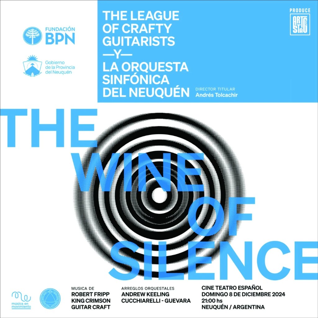 On December 8th, 2024, at Cine Teatro Español, The Wine Of Silence will bring together The League of Crafty Guitarists and the Orquesta Sinfónica Del Neuquén for a performance featuring Soundscapes (by Robert Fripp) orchestrated by Andrew Keeling; Guitar Craft and King Crimson pieces, blending the acoustic guitar ensemble with orchestral arrangements.